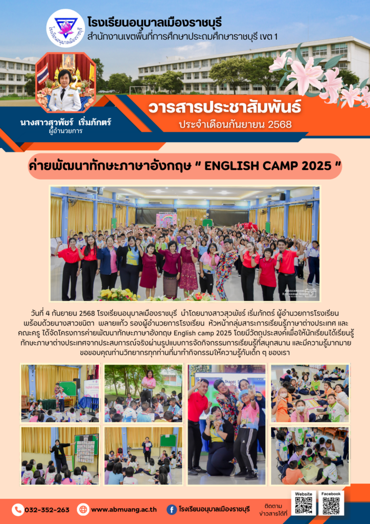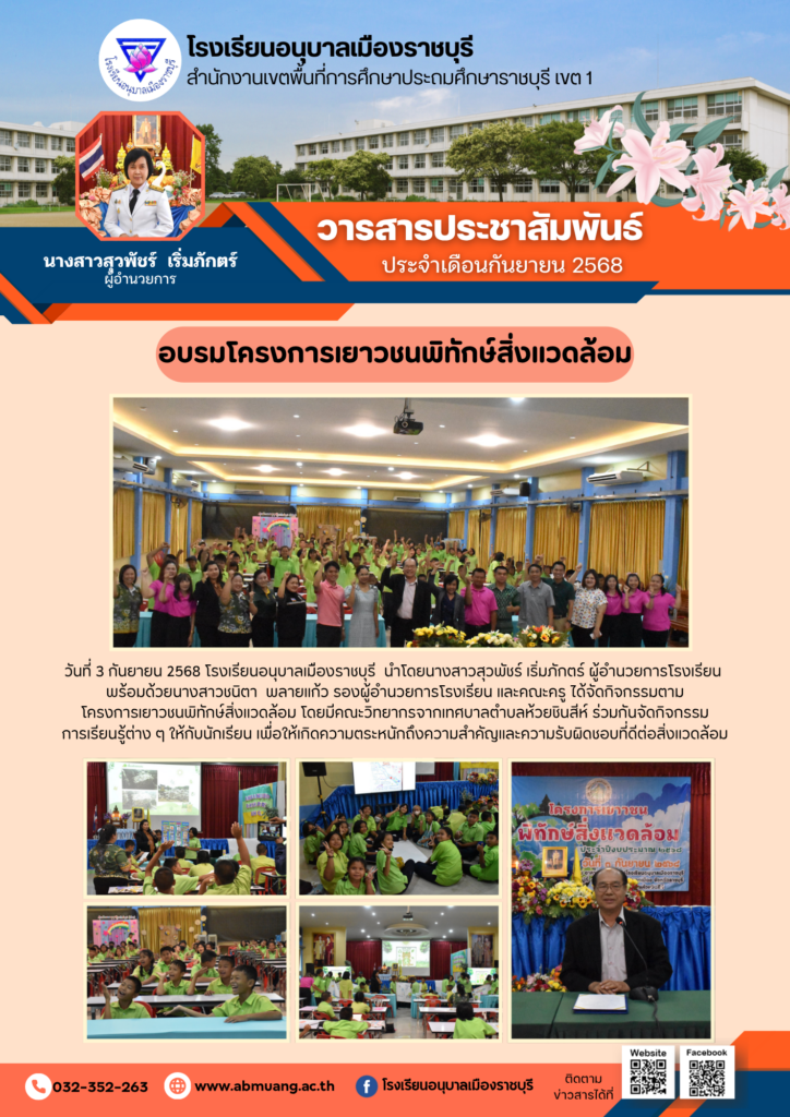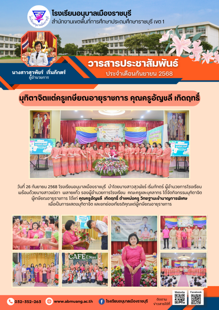 วารสารประชาสัมพันธ์ประจำเดือนกันยายน 2568 Posted by กาญจนา หินนาค Categories กิจกรรม Date 26 January 2026 วารสารประจำเดือนกันยายน 2568 ทางโรงเรียนอนุบาลเมืองราชบุรี นำโดยนางสาวสุวพัชร์ เริ่มภักตร์ ผู้อำนวยการโรงเรียน พร้อมด้วยคณะครูและบุคลากร ได้ดำเนินการกิจกรรมต่างๆ โดยมีรายการดังต่อไปนี้การอบรมโครงการเยาวชนพิทักษ์สิ่งแวดล้อมค่ายพัฒนาทักษะภาษาอังกฤษ “ English Camp 2025 ”มุทิตาจิตแต่ครูเกษียณอายุราชการ รูปภาพเพิ่มเติม>> CLICK HERE << กาญจนา หินนาค Previous post อบรมโครงการเยาวชนพิทักษ์สิ่งแวดล้อม 26 January 2026 Next post วารสารประชาสัมพันธ์ประจำเดือนพฤศจิกายน 2568 26 January 2026